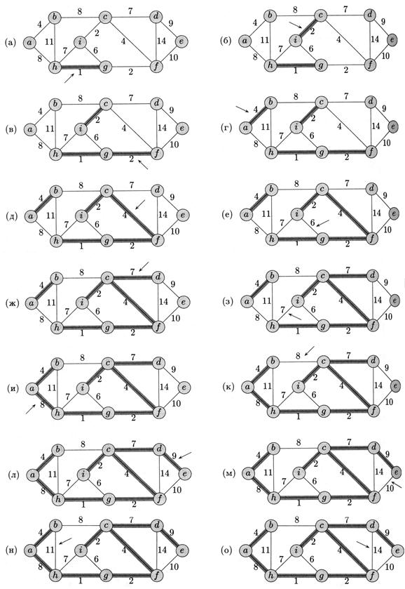 На рисунке 5.9 рёбра растущего леса (А) выделены серым цветом. Рёбра рассматриваются в порядке неубывания весов (текущее