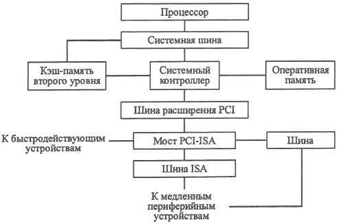 Современный компьютер принято разделять на аппаратную часть ("железо" - Hardware) и программное обеспечение (ПО - Software). На рис. 2.7 показана упрощенная схема системной ("материнской") платы персонального компьютера. В физическом исполнении на плате имеются соответствующие разъемы (слоты) для размещения процессора, модулей оперативной памяти, подключения устройств ввода/вывода.