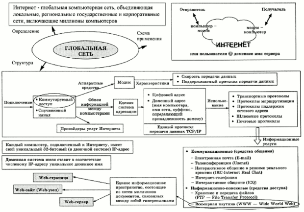 Язык гипертекстовой разметки HTML создан на опыте использования редактора TeX и системно- и аппаратно-независимых методов представления текста в электронной форме (Standard Generalized Markup Language - SGML, стандарт ISO 8879). Основная идея гипертекста заключается в присутствии внутри ASCII-текста форматирующих полей и ссылок как на части внутри документа, так и на другие документы. Благодаря этому можно просматривать документы в том порядке, в каком требуется, а не последовательно, как при чтении книг. База данных гипертекста является частью файловой системы, которая содержит текстовые файлы в формате HTML и связанные с ними графику, мультимедиа и другие ресурсы. Текстовый формат XML добавился несколько позже и был предназначен для описания систем хранения структурированных данных. Целью создания формата XML было обеспечение совместимости при передаче структурированных данных между разными системами обработки информации, особенно при передаче таких данных через Internet, а также для создания на его основе более специализированных языков разметки, иногда называемых словарями. Словари, основанные на XML, сами по себе формально описаны, что позволяет программно изменять и проверять документы на основе этих словарей, не зная их семантики, то есть не зная смыслового значения элементов. Важной особенностью XML также является применение так называемых пространств имен (Name Space). Для получения файла из Internet браузеру нужно знать, где находится файл и как общаться с компьютером, на котором этот файл находится. Программа-клиент WWW передает имя необходимого файла, его местоположение в Internet (адрес хоста) и метод доступа (обычно протокол HTTP или FTP). Комбинация этих элементов формирует универсальный идентификатор ресурса (Universal Resource Identifier - URI). URI определяет способ записи адресов различных информационных ресурсов. В основу URI были заложены идеи расширяемости, полноты и читаемости. Реализация URI для WWW является способом адресации в сети (Universal Resource Locator - URL). Общий формат ссылки URL - <протокол://узел/путь/файл /метка>. Internet является совокупностью эффективных методов коммуникации (на базе современных стандартизированных протоколов связи) и работы с информацией, находящейся на удаленных носителях. Кроме непосредственных функций по транзиту данных любых типов технологии Internet обеспечивают широкий спектр разнообразных информационных услуг, реализуемых различными службами: