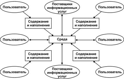 Большинство русскоязычных поисковых систем индексируют и ищут тексты на многих языках - украинском, белорусском, английском и др. Отличаются же они от "всеязычных" систем, индексирующих все документы подряд, тем, что в основном индексируют ресурсы, расположенные в доменных зонах, где доминирует русский язык, или другими способами ограничивают своих роботов русскоязычными сайтами. Наряду с универсальными поисковыми системами большой популярностью пользуются специализированные, такие как метапоисковые MetaCrawler.com и Nigma.ru, или осуществляющие "вертикальный" поиск (по конкретным типам: новости, картинки, видео, фото, вакансии, группы товаров и т. п.). Internet-технологии в бизнесе В недавнем прошлом основным режимом использования Internet являлся режим электронной почты. Электронная почта - это абсолютно необходимое средство коммуникации, однако в ряде важных случаев (например, при необходимости оперативного поиска информации на серверах, подключенных к сети) оно не является достаточным: обмен информацией происходит слишком долго. В таких случаях требуется подключение в Internet в режиме On-Line. До недавнего времени такое подключение обходилось пользователям существенно дороже, чем подключение в режиме электронной почты (расходуется больше телекоммуникационных ресурсов). Сейчас в мировом масштабе происходит скачкообразный переход на новые технологии телекоммуникаций, сопровождающийся резким увеличением пропускной способности каналов и таким же резким снижением стоимости их использования. Это уже привело к тому, что в США режим On-Line сегодня является основным режимом использования Internet. Естественно, это привлекает бизнесменов (оперативный доступ к информации является очевидным требованием бизнеса). Рис. 4.3. Модель информационной гиперсреды При использовании Internet в режиме On-Line потенциально доступны многие программные сервисные средства, обеспечивающие подключение к серверу в режиме удаленного терминала (Telnet), перекачку файлов (Ftp), поиск необходимых информационных ресурсов и т. д. Особенно важен тот факт, что потенциально любой пользователь, подключенный к Internet в режиме On-Line и обладающий так называемым IP-адресом, может создать свой собственный WWW-сервер, наполнив его актуальной информацией. Это открывает широкие возможности для бизнеса (реклама, каталоги и прайс-листы товаров и услуг, возможность дистанционных заказов и т. д.). Таким образом, не только информационная среда влияет на пользователя, но сам пользователь становится активным участником изменения среды (рис. 4.3). Многие коммерческие организации ранее мало использовали Internet-технологии из-за практически полного отсутствия безопасности информации при ее передаче по сети. По этой причине многие крупные компании, отделения которых располагаются в разных точках земного шара, до сих пор поддерживают собственные корпоративные глобальные сети с гарантированной безопасностью. Конечно, такие сети обходятся гораздо дороже, чем Интернет. В настоящее время начали появляться средства, обеспечивающие безопасность информации и при использовании Internet. Например, компания Sun Microsystems объявила о выпуске продукта SunScreen, основанного на использовании методов криптографии на уровне передачи фрагментов сообщения. На основе применения SunScreen компания может создать виртуальную защищенную корпо