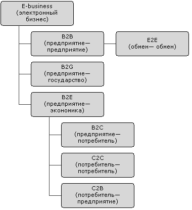 К недостаткам можно отнести необходимость приобретения специализированных программно-аппаратных средств (если их нет в компании), осуществления повышенных мер безопасности информации, необходимость работы через Internet-посредников (провайдеров), возможность потери критически важной для бизнеса информации. Рис. 4.4. Согласно стандарту OBI, электронной коммерцией считалось взаимодействие между бизнес-организациями посредством электронных технологий и Internet. Сейчас это только один из секторов рынка электронной коммерции, который называется "Бизнес - бизнес" (Business-to-Business). Электронную коммерцию в настоящее время принято разделять на несколько направлений (рис. 4.4), основными из которых считаются:
