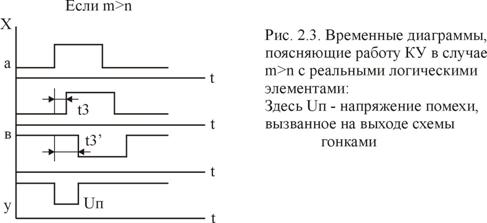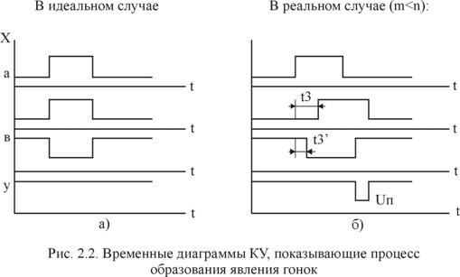 Комбинационное устройство (КУ) - это устройство с m входами и n выходами. Если КУ выполнено на базе идеальных, т.е. безинерционных элементов, состояние выходов однозначно определяется состоянием входов в тот же момент времени. Однако, инерционность элементов и наличие различных факторов, приводящих к задержке распространения сигнала, приводят к задержке появления выходных сигналов КУ, т.е. сигналы на выходе КУ, соответствующие новому состоянию входных сигналов, появляются не сразу, а с некоторой задержкой. При этом в переходный период возможно появление на выходах устройства некоторых промежуточных значений сигналов, не соответствующих заданному состоянию устройства. Такое явление получило название состязаний или гонок. Обычно, вырабатываемые узлами КУ промежуточные значения сигналов, представляют собой импульсы очень малой длительности, являющиеся помехой для всей цифровой системы. Они могут запускать непредусмотренное срабатывание триггеров, счетчиков и осуществлять нежелательные записи в регистры.