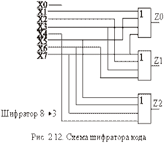 Схема шифратора семиразрядного позиционного кода в трехразрядный двоичный код приведена на рис.7.9. 2.12.