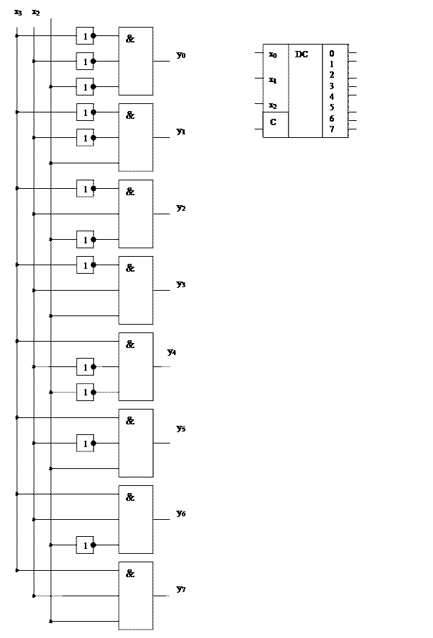 Из полученных уравнений и схемы дешифратора следует, что для реализации полного дешифратора на m входов (переменных) потребуются n = 2m элементов конъюнкции (количество входов каждого элемента “И” равно m)и m элементов отрицания.