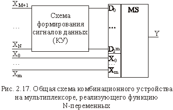 На базе мультиплексоров можно синтезировать комбинационные устройства, которые могут реализовать функции на большее число переменных, чем количество управляющих входов мультиплексора. Очевидно, и в этом случае, мультиплексор сохраняет свою универсальность, так как часть переменных реализуемой функции непосредственно подается на входы Х1... Хm мультиплексора (количество переменных, непосредственно подаваемых на управляющие входы мультиплексора равно m).