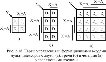На мультиплексорах с двумя управляющими входами легко можно синтезировать КУ при числе переменных N £ 6. На мультиплексорах с тремя и четырьмя управляющими входами можно синтезировать функции и большего количества переменных. Карты управления информационными входами для этих случаев показаны на рис. 2.18.