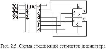 Синтез комбинационного устройства рассмотрим на примере реализации преобразователя кода для семисегментных индикаторов. Будем считать, что светодиодные семисегментные индикаторы выполнены с общим катодом, т.е. сегменты высвечиваются при подаче на них уровня логической единицы. Преобразователь кода представим в виде дешифратора с семью выходами (количество выходов КУ равно количеству реализуемых функций). Схема соединения выводов преобразователя к сегментам индикатора приведена на рис. 2.5. Обозначение сегментов индикатора стандартное и соответствует общепринятым