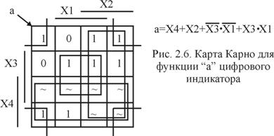 После заполнения таблицы состояния устройства составляются аналитические выражения (СНДФ) для каждой функции и строятся карты Карно, предназначенные для минимизации этих функций. Карты Карно можно заполнять и без записи СНДФ, что сократит количество действий разработчика при синтезе устройства. Очевидно, что без минимизации функции преобразователя получились бы весьма громоздкими, т.к. каждая содержала бы по девять минтермов, состоящих из четырех переменных. Порядок составления карт Карно и получения минимальных НДФ роли не играют. Для удобства с точки зрения последовательности изложения алгоритма действий, минимизацию начнем с функции а (рис.2.6), реализующей индикацию цифры 0.