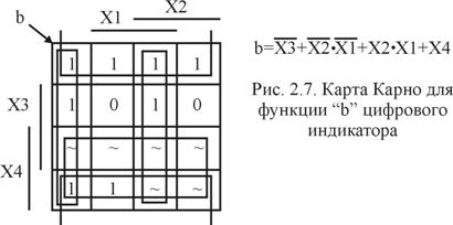 Для зажигания цифры 1 необходимо подать уровни логической “1” на сегменты “b” и “c” и т.д. Преобразователь предназначен для индикации цифр десятичной системы счисления, и поэтому значения функций для наборов переменных, начиная с номера 10, для индикатора безразличны. Безразличные значения функций обозначены знаком ~ (тильда).