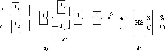 Поскольку полусумматор имеет широкое применение и его выпускают в виде отдельной микросхемы, он имеет собственное обозначение (рис. 2.20 б).