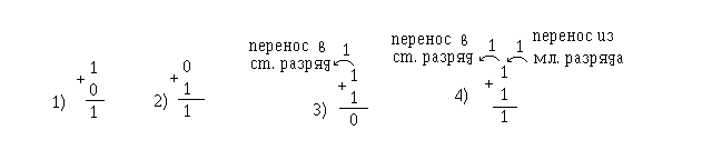 Из приведенных примеров (1 - 4) видно, что если отсутствует перенос из младшего разряда, то перенос в старший разряд может быть только в одном случае, когда оба числа равны единице. Если же имеется перенос из младшего разряда, то перенос в старший разряд будет всегда, кроме одного случая, когда оба слагаемых равны нулю.