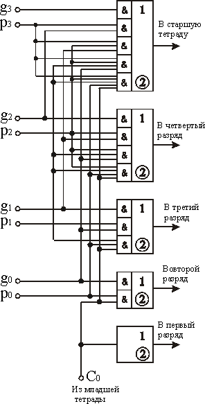 Очевидно, что хотя полученные выражения достаточно сложные, время формирования сигнала переноса в любой разрад с помощью вспомогательных функций определяется только времением здержки распространения сигнала на двух элементах. Эти функции реализуются специальным комбинационным устройством – схемой ускоренного переноса.