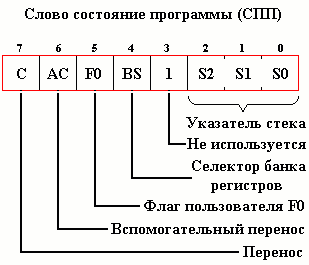 Наиболее "активным" флагом ССП является флаг переноса, которые принимает участие и модифицируется в процессе выполнения множеств операций, включая сложение, вычитание и сдвиги. Кроме того, флаг переноса (C) выполняет функции "булевого аккумулятора" в командах, манипулирующих с битами. Флаг переполнения (OV) фиксирует арифметическое переполнение при операциях над целыми числами со знаком и делает возможным использование арифметики в дополнительных кодах. АЛУ не управляет флагами селекции банка регистров (RS0, RS1), и их значение полностью определяется прикладной программой и используется для выбора одного из четырех регистровых банков.