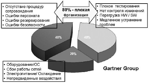 По исследованиям Gartner Group во многих случаях успешно внедренная система не реализует полностью свои функции из-за неудовлетворительного использования и сопровождения. Причин тому много: недостаточная подготовленность предприятия, плохо обученный персонал, отсутствие политики безопасности, устаревшее сетевое и электротехническое оборудование и т. д. (рис. 11.9).