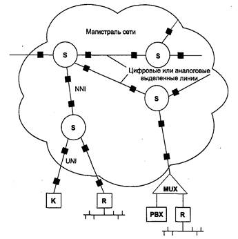 Типичный пример структуры глобальной компьютерной сети приведен на рис.3.5. Здесь используются следующие обозначения: S (switch) — коммутаторы, К — компьютеры, R (router) — маршрутизаторы, MUX (multiplexor) — мультиплексор, UNI (User-Network Interface) — интерфейс пользователь - сеть и NNI (Network-Network iterface) — интерфейс сеть - сеть. Кроме того, офисная АТС обозначена аббревиатурой РВХ, а маленькими черными квадратиками — аппаратура передачи данных (устройства DCE - Data Circuit terminal Equipment).