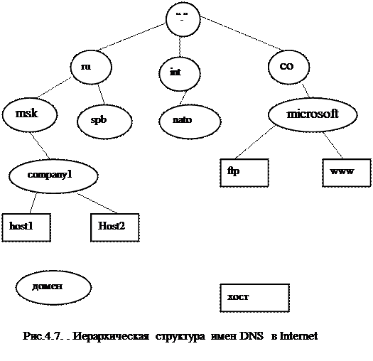 Система имен доменов (Domain Name System, DNS) появилась середине 80-х годов. DNS реализует иерархическое пространство имен. Единицей измерения является домен (территория, область). Понятие домена DNS не надо путать с доменом Windows NT или доменом NIS. Они не имеют друг к другу никакого отношения. На Рисунке 4.7. приведена часть иерархической структуры DNS сети Internet.