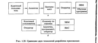 Дело в том, что стиль программирования ИнС непохож на стиль традиционного программирования с использованием обычных алгоритмических языков. На рис. 1.20 и 1.21 и в табл. 1.3 показаны характерные различия между ИнС и обычными программными системами.