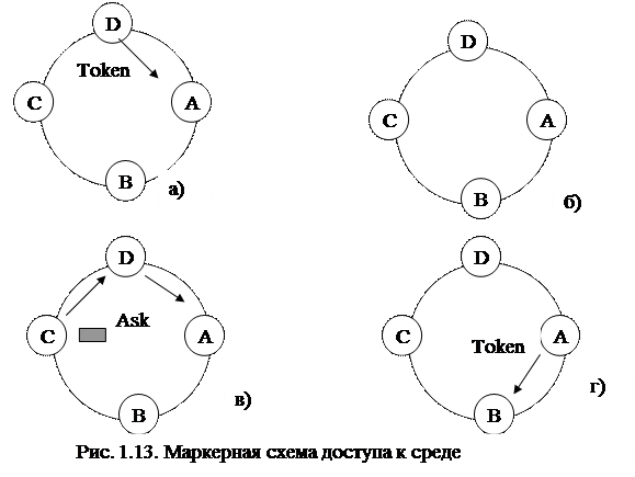 В качестве примера рассмотрим цепочку событий в системе, показанной на рис. где узел А хочет послать данные узлу С. Узел А ждет свободный маркер (рис. 1.13. а).