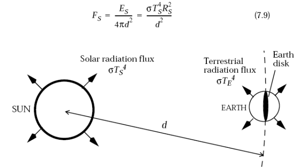 Излучаемая солнцем радиация, как черным телом при температуре TS=5800K, за единицу времени описывается законом Стефана-Больцмана и площадью поверхности Солнца