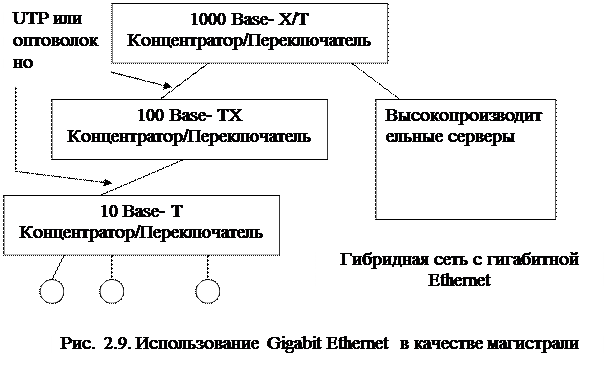 Гигабитная Ethernet — это дальнейшее расширение стандарта IEEE 802.3. По аналогии с быстрой Ethernet основные принципы работы (структура кадра, доступ к среде по протоколу CSMA/CD) были сохранены, что позволяет использовать в этой схеме более медленные Ethernet-стандарты, в то время как скорость работы была увеличена. На рис.2.9 показан типичный пример гигабитной Ethernet, где она используется как магистраль между концентраторами типа 100Base-T. В таком варианте гигабитная Ethernet заменяет старые технологии, подобные FDDI. Несмотря на то, что в этом случае узлы должны быть заменены, можно использовать те же оптоволоконные связи с существенным увеличением скоростей. И хотя нет никакой технической причины напрямую использовать гигабитную Ethernet для терминалов, все еще существует несколько типов настольных компьютеров, требующих столь высоких скоростей передачи данных.