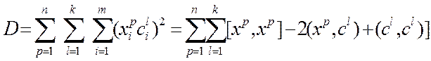 Где первая сумма- это сумма по всем объектам, а вторая - по всем кластерам.