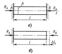 В статически неопределимых системах при изменении температуры возникают дополнительные силы. Если нагреть стержень, жестко закрепленный по концам (рис.2.42, а), то его длина не может изменяться: этому препятствуют жесткие заделки. В опорах (заделках) возникают реакции, сжимающие стержень.