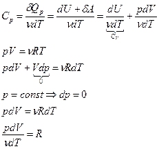 Это объясняется тем, что при нагревании газа при постоянном давлении требуется дополнительное количество теплоты на совершение работы по расширению газа, т.к. постоянство давления обеспечивается увеличением объёма газа.