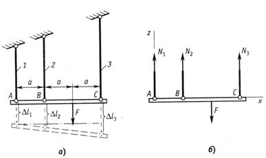 (рис.2.46, а). Стержни изготовлены из одного материала и имеют одинаковые площади поперечного сечения. Длины стержней равны