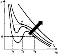 сжатие приводит к падению давления, чего не бывает. Наличие этого участка означает, что при изменении объёма вещество не может долго оставаться всё время в виде однородной среды; в некоторый момент должно наступить скачкообразное изменение состояния и распад вещества на две фазы. Таким образом, истинная изотерма будет иметь вид ломанной линии