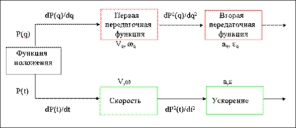 Кинематическими передаточными функциями механизма называются производные от функции положения по обобщенной координате. Первая производная называется первой передаточной функцией или аналогом скорости (обозначается Vq,wq), вторая - второй передаточной функцией или аналогом ускорения (обозначается aq, eq).