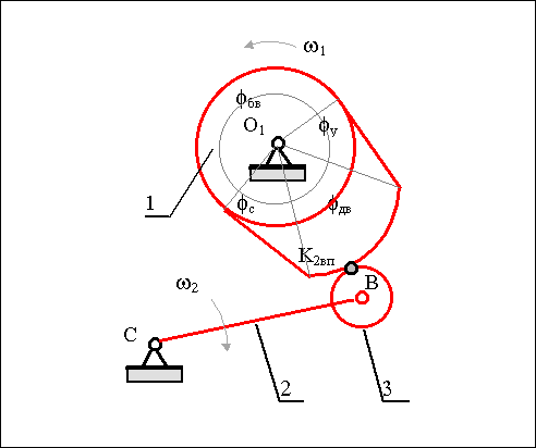 | Диаграммы функции положения и передаточных функций для зубчатой передачи. 3. Метод цикловых кинематических диаграмм (кулачковые механизмы). Кулачковым называется трехзвенный механизм состоящий из двух подвижных звеньев - кулачка и толкателя, соединенных между собой высшей кинематической парой. Часто в состав механизма входит третье подвижное звено - ролик, введенное в состав механизма с целью замены в высшей паре трения скольжения трением качения. При этом механизм имеет две подвижности одну основную и одну местную (подвижность ролика). Основные параметры кулачкового механизма: fраб - фазовый рабочий угол кулачкового механизма; fраб = dраб = fc + fдв + fу; fс - угол сближения; fдв - фазовый угол дальнего выстоя; fу - фазовый угол удаления; dраб - профильный рабочий угол; fбв - угол ближнего выстоя; hBm - максимальное перемещение точки В толкателя; r0 - радиус начальной шайбы кулачка; rр - радиус ролика. | ||