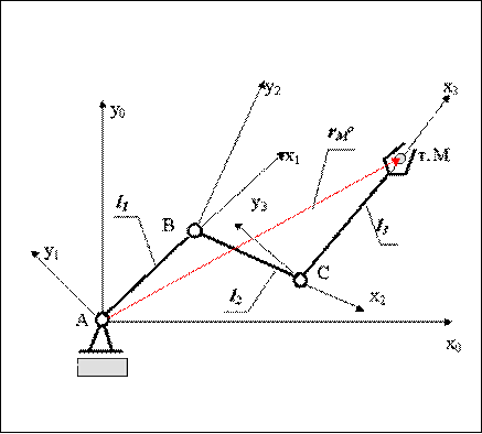 При использовании метода преобразования координат задача о положении выходного звена решается путем перехода из системы в которой это положение известно в систему в которой его требуется определить. Переход от системы к системе осуществляется перемножением матриц перехода в соответствующей последовательности.