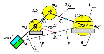 Корректирующая масса, обеспечивающая уравновешивание горизонтальной составляющей главного вектора сил инерции кривошипо-ползунного механизма, размещается на первом звене механизма и равна сумме составляющих mk1 = mk1+ mk1 = (m2 + m3 + mB1 )lАВ / lk1.