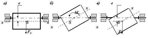 В зависимости от взаимного расположения оси вращения и главной цетральной оси инерции x-x, по ГОСТ 19534-74, различают следующие виды неуравновешенности роторов (рис. 5.8): а - статическую, когда эти оси параллельны; б - моментную, когда оси пересекаются в центре масс ротора S; в - динамическую, когда оси либо пересекаются вне центра масс, либо не пересекаются, а перекрещиваются в пространстве.