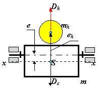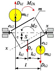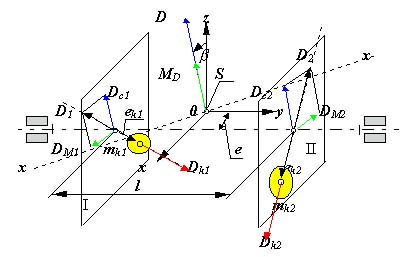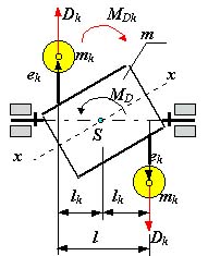 т.е. необходимо уравновесить вектор Dс и момент дисбалансов МD . Для этого достаточно разместить на роторе две корректирующих массы mk1 и mk2 на расстояниях от оси вращения ek1 и ek2, а от ценра масс S, соответственно на lk1 и lk2. Массы выбираются и размещаются так, чтобы момент их дисбалансов MDk был по величине равен, а по направлению противоположен моменту дисбалансов ротора МD: