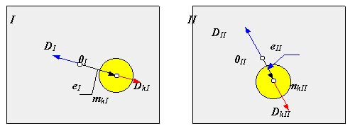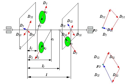 На детали выбирают две плоскости коррекции и каждый вектор дисбаланса расклад ывают на две составляющие, расположенные в плоскостях коррекции. Затем составляю щие векторы дисбалансов в плоскостях коррекции суммируются и их равнодействующи й дисбаланс, например, DI, уравновешивается соответств ующей корректирующей массой mIk. Пример такого уравновешивания изображен на рис. 5.14.