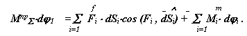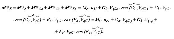 Для определения суммарного приведенного момента необходимо просуммировать приведенные моменты от всех внешних сил, действующих на рассматриваемую систему. Приведенный момент от силы равен скалярному произведению вектора силы на вектор передаточной функции точки ее приложения, от момента - произведению момента на передаточное отношение от звена приложения момента к звену приведения. На рассматриваемую систему действуют силы веса звеньев Gi, сила сопротивления Fс и движущий момент Мд . Приведенный момент от этих сил рассчитывается по формуле: