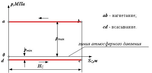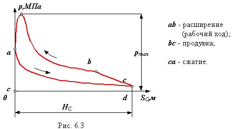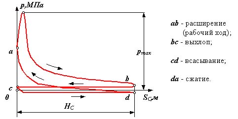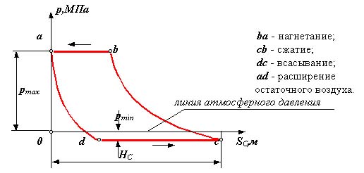 o Линии bc и ad - линии сжатия и расширения газа (воздуха) определяются параметрами газа (объемом, давлением и температурой) и в общем виде описываются уравнением политропы p× Vn = const, где n - показатель политропы (1< n < 0).