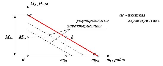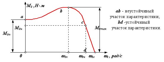 - асинхронный электродвигатель переменного тока На диаграмме: Мдп - пусковой момент; Мдн - номинальный крутящий момент; Мдк или Мдmax - критический или максимальный момент; w дн - номинальная круговая частота вращения вала двигателя; w дхх или w дс - частота вращения вала двигателя холостого хода или синхронная. Уравнение статической характеристики асинхронного электродвигателя на линеаризованном участке устойчивой части