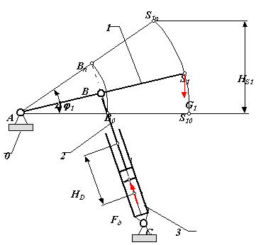 Для того, чтобы выполнить условия начала движения и остановки выходного звена в конечном положении необходимо соответствующим образом выбрать закон изменения движущих или управляющих сил. Три возможных диаграммы изменения движущих сил даны на рис. 7.5. Определение величин сил на этих диаграммах осуществляется из рассмотренных выше условий. Выведем формулы для расчета сил, используя в качестве примера механизм гидравлического подъемника, схема которого приведена на рис. 7.6.