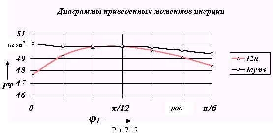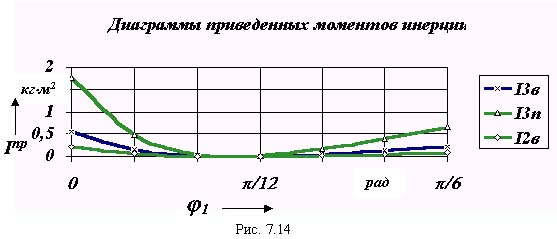 Графики переменной части суммарного приведенного момента инерции даны на рис. 7.13 и 7.14. Кроме того, имеется и постоянная часть Iпрå c, определяемая массой и моментом инерции звена 1