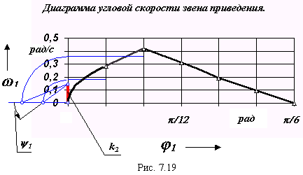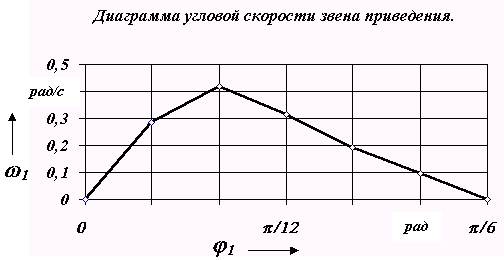 Определение закона движения звена приведения в виде диаграммы изменения угловой скорости в функции обобщенной координаты w 1= f(j 1) проводится по формуле