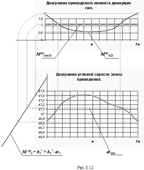 Рассмотрим решение задачи методом последовательных приближений для машинного агрегата с приводом от асинхронного электродвигателя (пример с поршневым насосом в лекции 6). При первом приближении решается задача определения закона движения без учета статической характеристики, по алгоритму описанному в предыдущем разделе. Затем определяется приведенная статическая характеристика и по ней определяются значения движущего момента при каждом значении угловой скорости, рассчитанной на первом этапе (при первом приближении). По этим значениям момента строится диаграмма движущего момента второго приближения Мпрд(2), затем определяется суммарная работа, кинетическая энергия первой группы звеньев и угловая скорость звена приведения при втором приближении. Далее эти действия повторяются пока различия между результатами расчета на последующем этапе будут отличаться от результатов предыдущего на величину меньшую заданной погрешности. На рис. 8.12 показано графическое решения задачи при втором приближении.