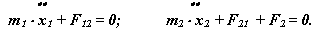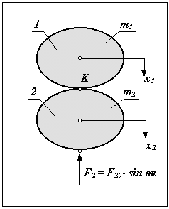 Рассмотрим механическую систему (рис. 9.1), состоящую из двух подвижных звеньев, образующих между собой кинематическую пару. Для упрощения предположим, что движение звеньев возможно только по одной координате x. Масса первого звена m1, второго - m2. На звено 2 действует периодическая внешняя сила F2 = F20 *sin wt, действием сил веса принебрегаем Уравнения движения звеньев