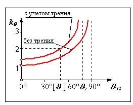 момент сопротивления М с3. На этапе проектирования массы и моменты инерции звеньев не Рис. 10.7 определены, поэтому движущая сила действующая на ведомое звено - реакция F32 направлена по линии ВС, скорость точки ее приложения на звене 3 - VC направлена всторону w 3 перпендикулярно звену 3. Угол J 32 между векторами F32 и VC - угол давления во вращательной паре С. С увеличением этого угла тангенциальная составляющая силы Ft32, способствующая повороту звена 3 в направлении w 3, уменьшается, а нормальная Fn32, которая не влияет на движение, а только деформирует (сжимает) звено 3, увеличивается. То есть с увеличением угла давления условия передачи сил в КП ухудшаются. Так как в реальных КП всегда имеется трение, то при определенной величине угла давления в КП возможно самоторможение или заклинивание. Самоторможение или заклинивание - это такое состояние механизма, когда в результате возрастания углов давления в одной из КП, движение механизма становится невозможным при сколь угодно большом значении движущей силы. Часто для характеристики условий передачи сил пользуются коэффициентом возрастания усилий (без учета трения)