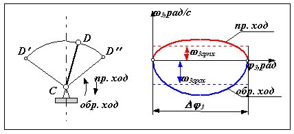 При проектировании технологических машин, в которых нагрузка на выходном звене механизма на рабочем или прямом ходе намного больше нагрузки на холостом или обратном ходе, желательно, чтобы скорость выходного звена на прямом ходе была меньше, чем на обратном. С целью сокращения времени холостого хода, тоже необходимо увеличивать скорость при обратном ходе. Поэтому при метрическом синтезе механизма часто надо подбирать размеры звеньев обеспечивающие заданный коэффициент неравномерности средней скорости.