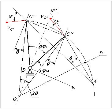 от оси х откладывается начальное положение выходного звена и его рабочее перемещение точки С в начальном и в конечном положениях соединяют прямой и от перпендикуляров к этой прямой откладываем углы q и проводим лучи C'О определяем точку О - центр окружности r0 проходящей через точки C', и искомую точку A. Положение точки A на этой окружности определяется в зависимости от исходных данных: