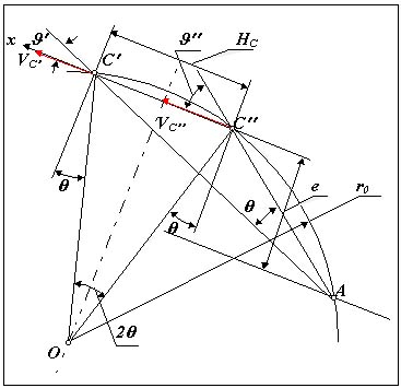 - в точке C от вектора скорости VC' откладывается угол давления J? = [ J ], и проводится луч до пересечения с окружностью r0 в точке A;