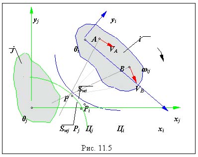 Понятие о полюсе и центроидах. Рассмотрим два твердых тела i и j, которые совершают друг по отношению к другу плоское движение. Свяжем с телом i систему координат 0i xiyi, а с телом j систему координат 0jxjyj . Плоское движение тела i относительно тела j в рассматриваемый момент эквивалентно вращению вокруг мгновенного центра скоростей или полюса P. Тогда геометрическое место полюсов относительного вращения в системе координат 0ixiyi называется подвижной Цi, а в системе координат 0jxjyj неподвижной Цj центроидой. В процессе рассматриваемого движения цетроиды контактируют друг с другом в полюсах относительного вращения и поэтому перекатываются друг по другу без скольжения, т.е.
