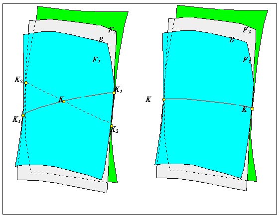 Теорема Оливье. Пусть F1 , F2 и B некоторые поверхности с определенным абсолютным движением. И пусть F1 и F2 огибающие к B в их относительном движении, где - мгновенные контактные линии. Если K1 -K1 и K2 -K2 имеют общие точки, то поверхности F1 и F2 :